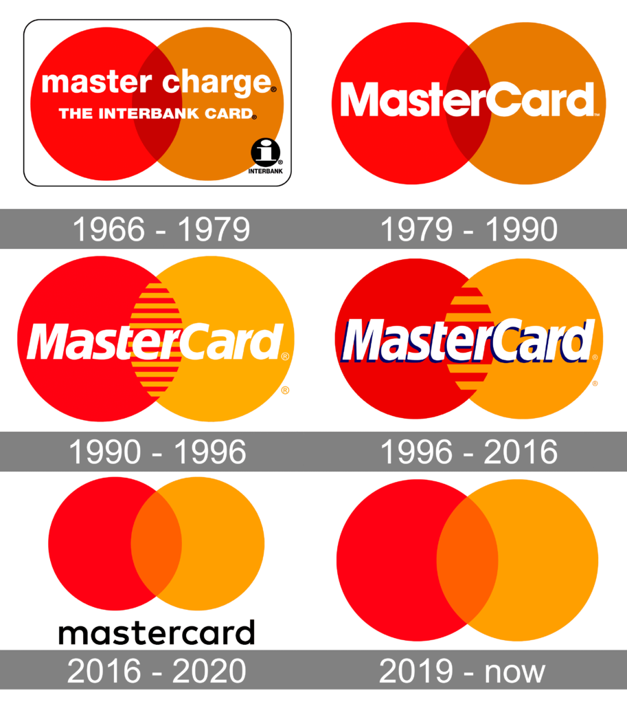 A timeline featuring the evolution of Mastercard’s logo across the decades.